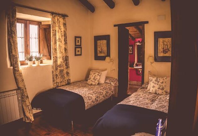 Capacidad máxima de 12 plazas distribuidas en 5 habitaciones, (dos de ellas con cama de matrimonio, otras dos con 2 camas individuales cada una y una buhardilla diáfana de 40 m2 con cuatro camas individuales). 4 cuartos de baño completos con suelo de madera o piedra, duchas de piedra natural y grifería rústica. Tres habitaciones con baño privado, en suite. La calefacción es regulable individualmente en cada estancia.