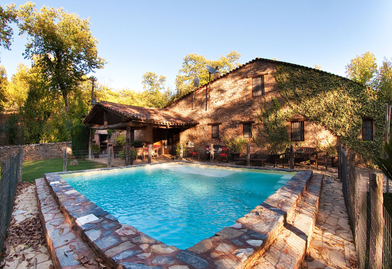 Confortable casa rural de 300 m2 construida con gruesos muros de piedra. Suelo de madera de roble. Ventanas y vigas de madera de castaño. Tejado de teja árabe. A/A. Dos porches de 40 m2 cada uno. Piscina de agua salada, amplia zona de césped y barbacoa.